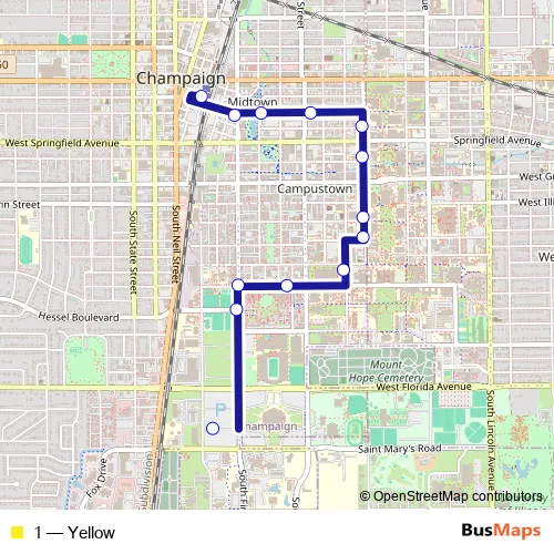 The first stop of the 1 bus route is Illinois Terminal (Platform C) and the last stop is Lot E-14 (North Shelter). 1 (Yellow) is operational during on weekdays.