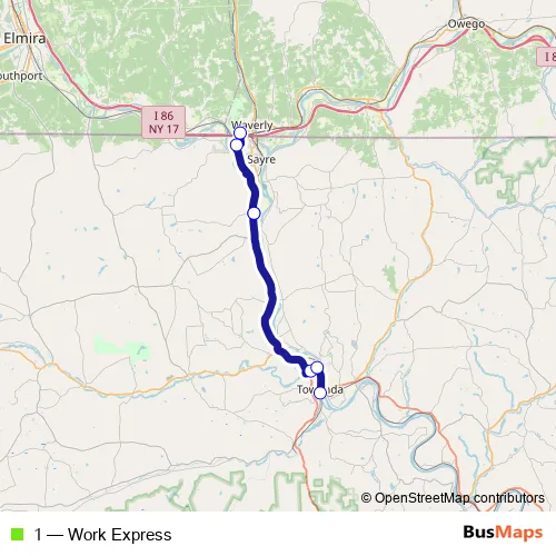 The first stop of the 1 bus route is Best Transit, Athens and the last stop is Best Transit, Towanda/Progress Plaza. 1 (Work Express) is operational during on weekdays.
