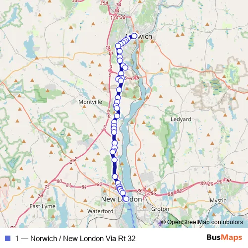 The first stop of the 1 bus route is Norwich Transportation Center and the last stop is New London Union Station. 1 (Norwich / New London Via Rt 32) is operational during everyday.
