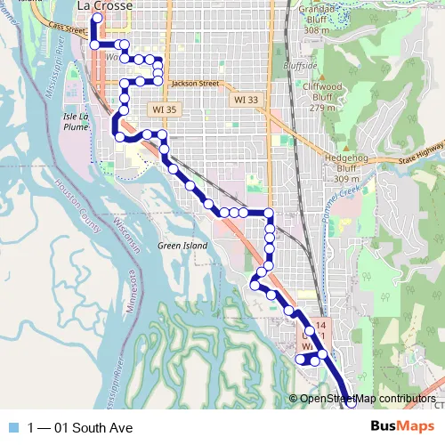 The first stop of the 1 bus route is Grand River Station 1 and the last stop is 33rd & Mormon Coulee. 1 (01 South Ave) is operational during everyday.