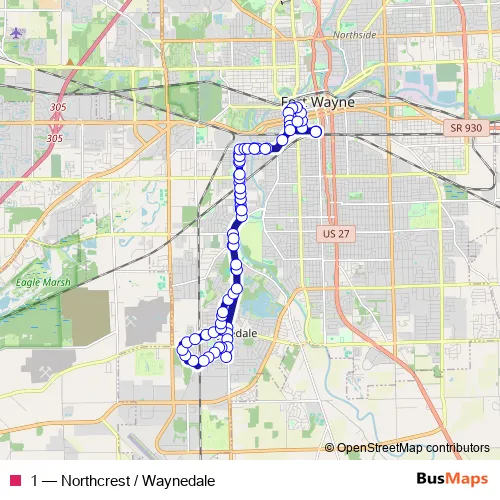 The first stop of the 1 bus route is Central Station - Bay D and the last stop is Central Station - Bay A. 1 (Northcrest / Waynedale) is operational during everyday.