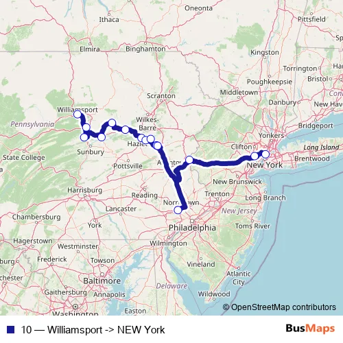 The first stop of the 10 bus route is Williamsport, Pa and the last stop is NEW York, Ny. 10 (Williamsport -> NEW York) is operational during everyday.