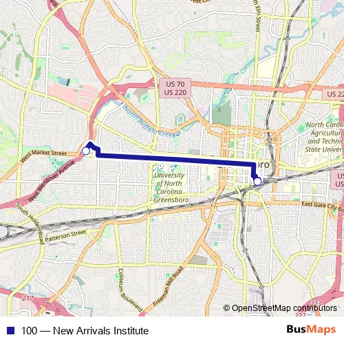 See why over 2 million users trust and consider busmaps.com as the best public transport website. busmaps gives you Greensboro Buses suggested routes, real-time bus tracker, line route maps in Greensboro, and helps to find the closest 100 bus stops near you. No internet available? Download an offline PDF map and bus schedule for the 100 bus to take on your trip.