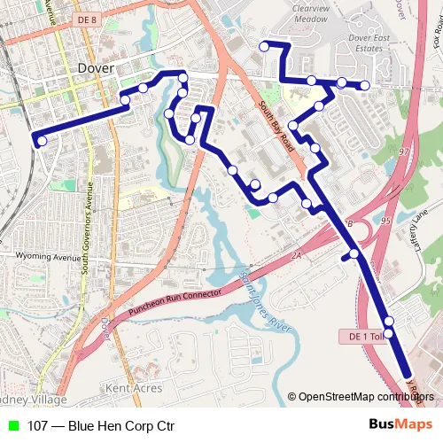The first stop of the 107 bus route is Dover Transit Center and the last stop is Babb Drive & Luther Village. 107 (Blue Hen Corp Ctr) is operational during on weekdays.