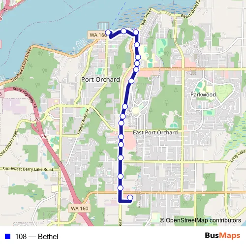 The first stop of the 108 bus route is Fred Meyer Port Orchard and the last stop is Port Orchard Transit Center. 108 (Bethel) is operational during everyday.