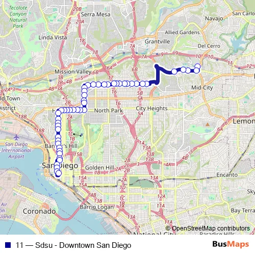 See why over 2 million users trust and consider busmaps.com as the best public transport website. busmaps gives you San Diego Buses suggested routes, real-time bus tracker, line route maps in San Diego, and helps to find the closest 11 bus stops near you. No internet available? Download an offline PDF map and bus schedule for the 11 bus to take on your trip.