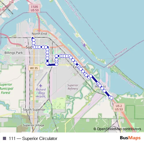 The first stop of the 111 bus route is Banks Ave L.O. and the last stop is Holiday Station Itasca. 111 (Superior Circulator) is operational during everyday.