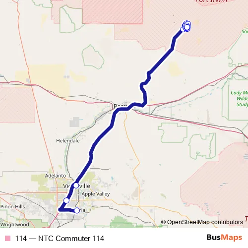 The first stop of the 114 bus route is Smoke Tree St WB (Vvta) and the last stop is Fort Irwin Bus Lot (Do). 114 (NTC Commuter 114) is operational during on weekdays.