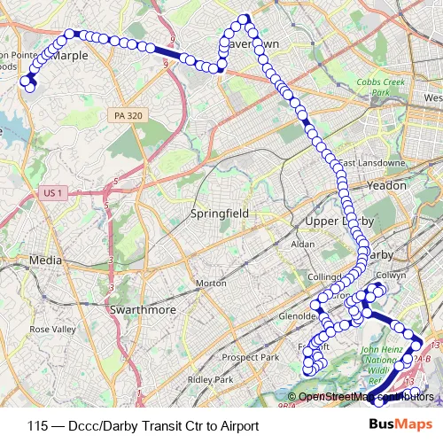 The first stop of the 115 bus route is Darby Transit Center - bus and the last stop is Philadelphia Airport Terminal B. 115 (Dccc/Darby Transit Ctr to Airport) is operational during everyday.
