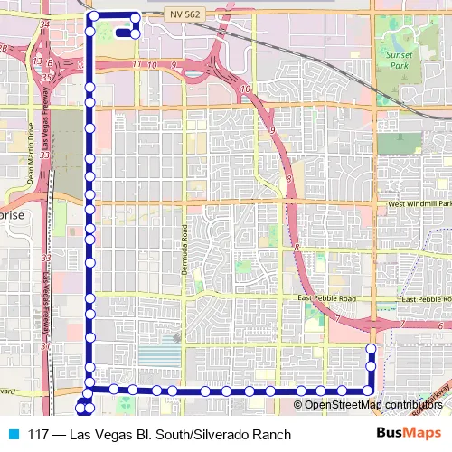 The first stop of the 117 bus route is SB Eastern after Serene and the last stop is Sstt Exit. 117 (Las Vegas Bl. South/Silverado Ranch) is operational during everyday.