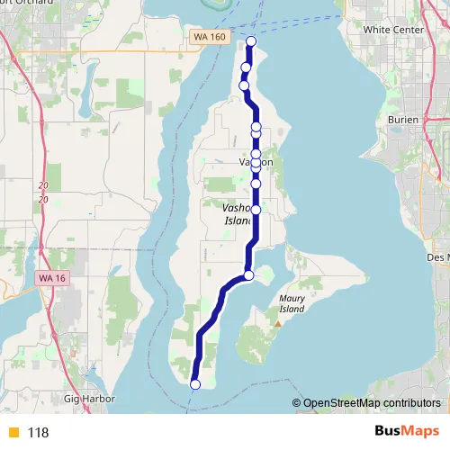 The first stop of the 118 bus route is SW Tahlequah Rd & Sr 163 and the last stop is Vashon Ferry Dock & 103rd Ave Sw. 118 is operational during everyday.