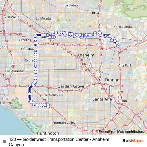 The first stop of the 123 bus route is Anaheim Canyon Metrolink Station Dock 2 and the last stop is Goldenwest Trans CTR Dock 6. 123 (Goldenwest Transportation Center - Anaheim Canyon) is operational during on weekdays.