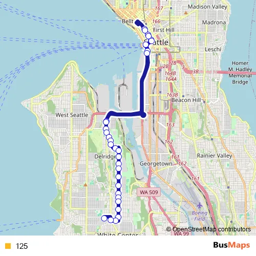 The first stop of the 125 bus route is Delridge Way SW & SW Andover St and the last stop is 25th Ave SW & SW Trenton St. 125 is operational during everyday.