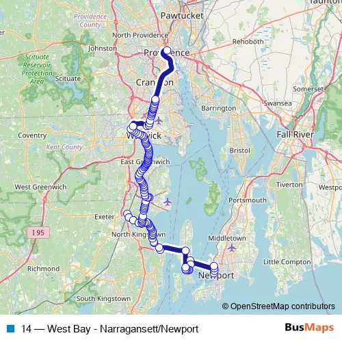 The first stop of the 14 bus route is Newport Transit Center (Stop D) and the last stop is Kennedy Plaza (Stop Z). 14 (West Bay - Narragansett/Newport) is operational during everyday.