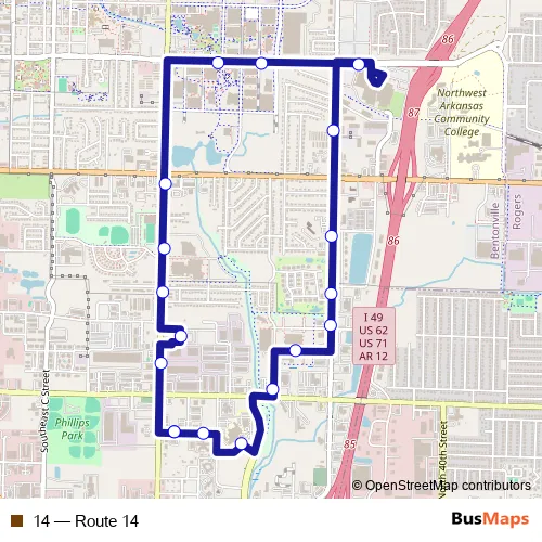 See why over 2 million users trust and consider busmaps.com as the best public transport website. busmaps gives you Bentonville Buses suggested routes, real-time bus tracker, line route maps in Bentonville, and helps to find the closest 14 bus stops near you. No internet available? Download an offline PDF map and bus schedule for the 14 bus to take on your trip.