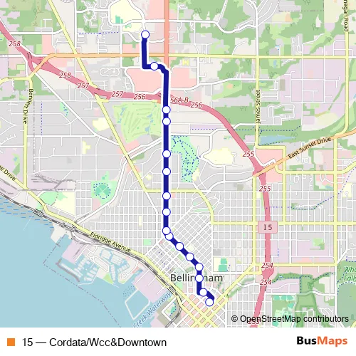The first stop of the 15 bus route is Bellingham Station and the last stop is Cordata Station. 15 (Cordata/Wcc&Downtown) is operational during everyday.