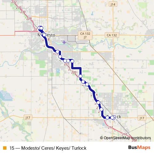 The first stop of the 15 bus route is Golden State Blvd. & W. Main St. (Central Park) and the last stop is 9th St. & J St. (Modesto Transit Center). 15 (Modesto/ Ceres/ Keyes/ Turlock) is operational during everyday.