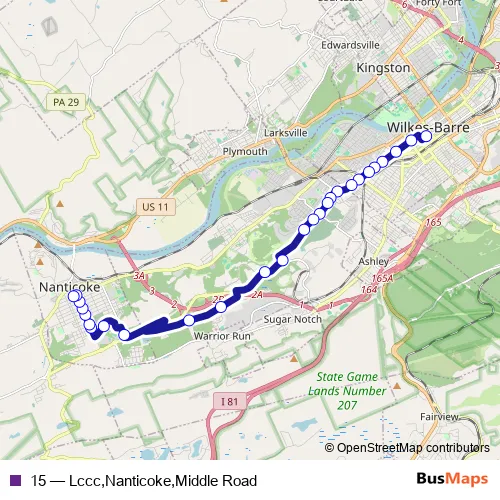 The first stop of the 15 bus route is Intermodal Transit Center and the last stop is Bus Stop Cafe. 15 (Lccc,Nanticoke,Middle Road) is operational during everyday.