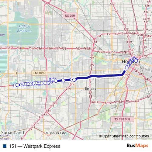 The first stop of the 151 bus route is Mission Bend Transit Center and the last stop is Congress St @ La Branch St. 151 (Westpark Express) is operational during on weekdays.
