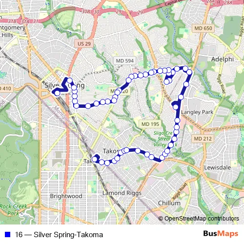The first stop of the 16 bus route is Takoma Station & BAY H and the last stop is Silver Spring Station & BAY 108. 16 (Silver Spring-Takoma) is operational during everyday.