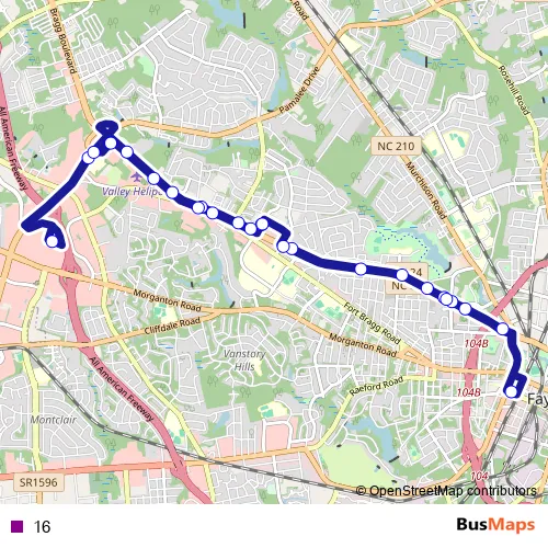 The first stop of the 16 bus route is Fast Transit Center and the last stop is 1045 Bragg Blvd [Nc-24/Nc-87]. 16 is operational during on weekdays.