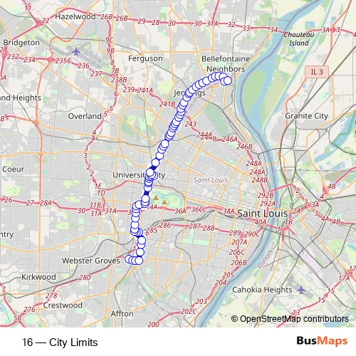 The first stop of the 16 bus route is Shrewsbury-Lansdowne I-44 Transit Center and the last stop is Riverview Transit Center. 16 (City Limits) is operational during everyday.