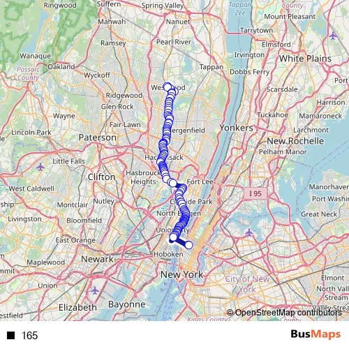 See why over 2 million users trust and consider busmaps.com as the best public transport website. busmaps gives you Hackensack Buses suggested routes, real-time bus tracker, line route maps in Hackensack, and helps to find the closest 165 bus stops near you. No internet available? Download an offline PDF map and bus schedule for the 165 bus to take on your trip.