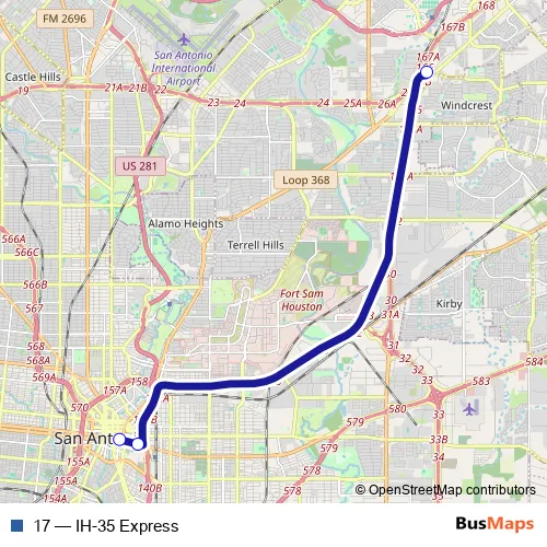 See why over 2 million users trust and consider busmaps.com as the best public transport website. busmaps gives you San Antonio Buses suggested routes, real-time bus tracker, line route maps in San Antonio, and helps to find the closest 17 bus stops near you. No internet available? Download an offline PDF map and bus schedule for the 17 bus to take on your trip.