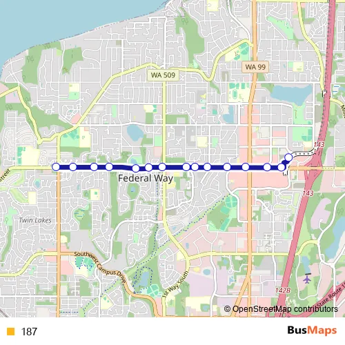 The first stop of the 187 bus route is Federal Way Downtown Station - Bay 2 and the last stop is SW 320th St & 21st Ave Sw. 187 is operational during everyday.
