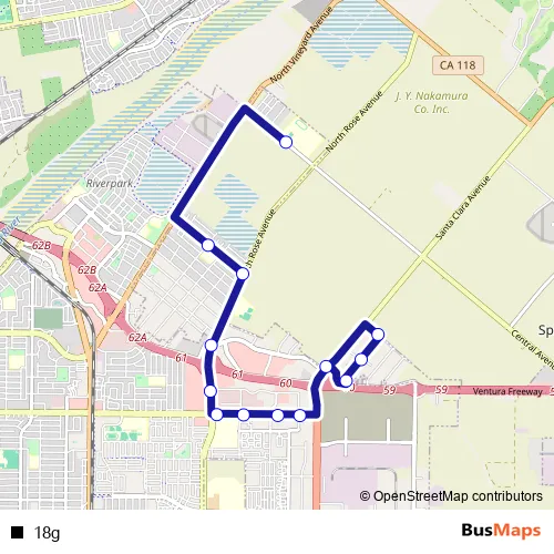 The first stop of the 18g bus route is Central & Rio Mesa Hs and the last stop is Santa Clara & Auto Ctr. 18g is operational during on weekdays.