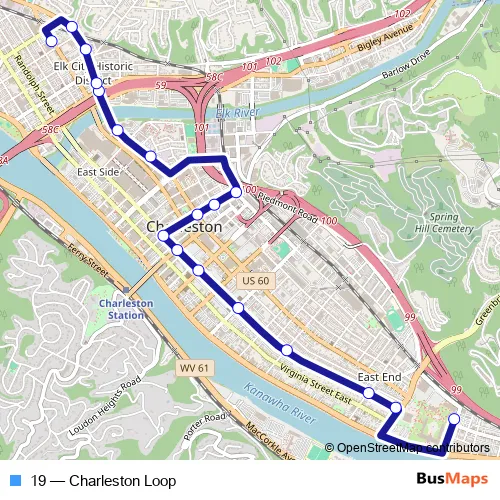 The first stop of the 19 bus route is Capitol Complex and the last stop is Lee & Maryland Ave. 19 (Charleston Loop) is operational during everyday.