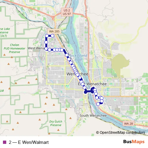 The first stop of the 2 bus route is Walmart and the last stop is East Wenatchee Park-and-Ride. 2 (E Wen/Walmart) is operational during everyday.
