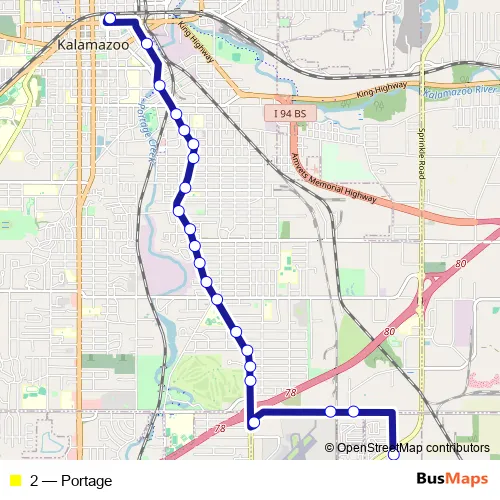 The first stop of the 2 bus route is 5419 Meridith and the last stop is Kalamazoo Transit Center. 2 (Portage) is operational during everyday.