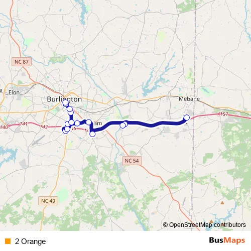 The first stop of the 2 Orange bus route is Mebane Cone Health Park and Ride Lot and the last stop is Across from Burlington City Hall (Inbound). 2 Orange is operational during everyday.