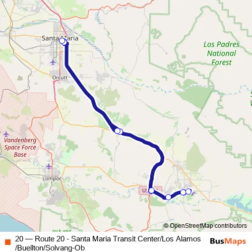 The first stop of the 20 bus route is Transit Center and the last stop is Transit Center. 20 (Route 20 - Santa Maria Transit Center/Los Alamos/Buellton/Solvang-Ob) is operational during on weekdays.