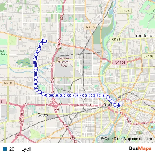 The first stop of the 20 bus route is TC- Gate 23 and the last stop is Greece Ridge Mall Connection Hub. 20 (Lyell) is operational during everyday.