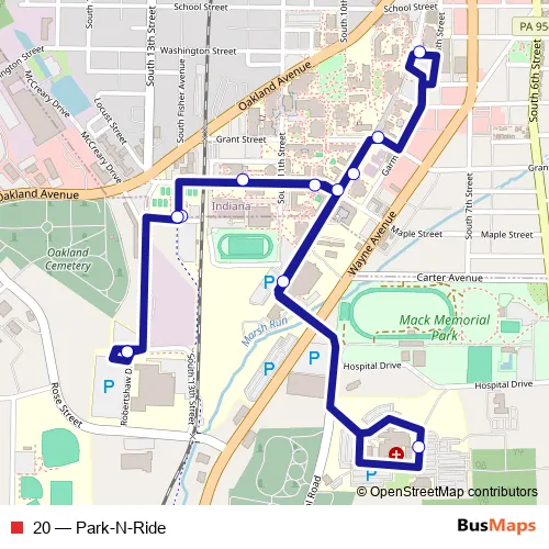 The first stop of the 20 bus route is IUP Robertshaw Bus Shelter and the last stop is IUP Robertshaw Bus Shelter. 20 (Park-N-Ride) is operational during on weekdays.