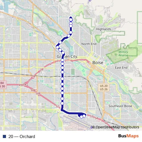 The first stop of the 20 bus route is N 36th St & W Shasta St Sec and the last stop is Boise Airport. 20 (Orchard) is operational during everyday.