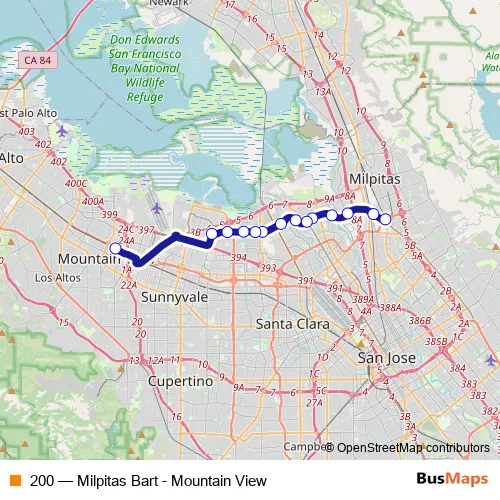 Click here to view the nearest 200 - Milpitas Bart - Mountain View bus stop.