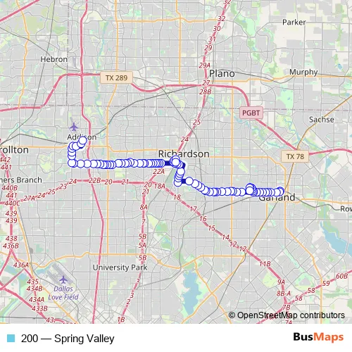 The first stop of the 200 bus route is Downtown Garland Station and the last stop is Addison Transit Center. 200 (Spring Valley) is operational during everyday.