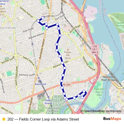 Bus 202 - Fields Corner Loop via Adams Street Schedule in Boston