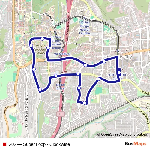 The first stop of the 202 bus route is UTC Transit Center and the last stop is UTC Transit Center. 202 (Super Loop - Clockwise) is operational during everyday.