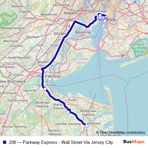 The first stop of the 206 bus route is Lincroft Park & Ride, Gsp Exit 109 and the last stop is New York - Broadway @ Exchange Pl (Northbound). 206 (Parkway Express - Wall Street Via Jersey City) is operational during everyday.