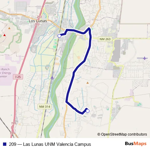 The first stop of the 209 bus route is U.N.M. Valencia and the last stop is Los Lunas Rail Runner Station. 209 (Las Lunas UNM Valencia Campus) is operational during everyday.