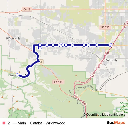 The first stop of the 21 bus route is Main St EB & Cataba Rd and the last stop is Wrightwood Community Center. 21 (Main + Cataba - Wrightwood) is operational during everyday.