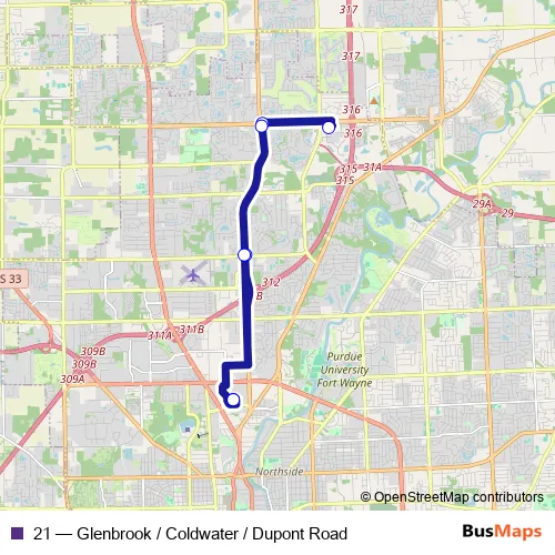 See why over 2 million users trust and consider busmaps.com as the best public transport website. busmaps gives you Fort Wayne Buses suggested routes, real-time bus tracker, line route maps in Fort Wayne, and helps to find the closest 21 bus stops near you. No internet available? Download an offline PDF map and bus schedule for the 21 bus to take on your trip.