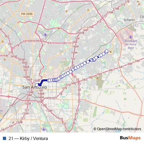 See why over 2 million users trust and consider busmaps.com as the best public transport website. busmaps gives you San Antonio Buses suggested routes, real-time bus tracker, line route maps in San Antonio, and helps to find the closest 21 bus stops near you. No internet available? Download an offline PDF map and bus schedule for the 21 bus to take on your trip.