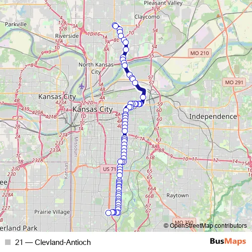 The first stop of the 21 bus route is Antioch Center Park & Ride Southbound Lane and the last stop is 75th & Prospect Transit Center (Local B). 21 (Clevland-Antioch) is operational during everyday.
