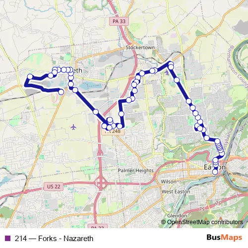 The first stop of the 214 bus route is Eitc - Easton Intermodal Transit Center and the last stop is Nazareth Plaza Eb. 214 (Forks - Nazareth) is operational during everyday.