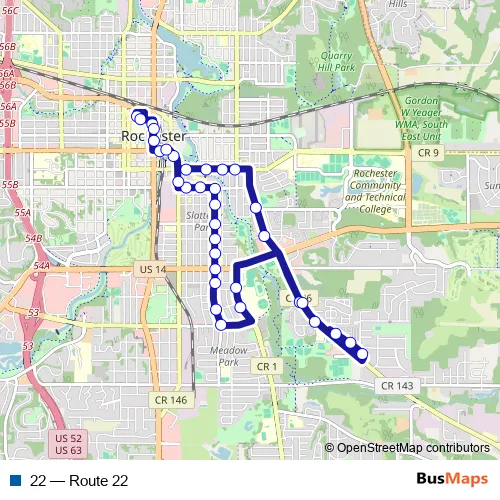 See why over 2 million users trust and consider busmaps.com as the best public transport website. busmaps gives you Rochester Buses suggested routes, real-time bus tracker, line route maps in Rochester, and helps to find the closest 22 bus stops near you. No internet available? Download an offline PDF map and bus schedule for the 22 bus to take on your trip.
